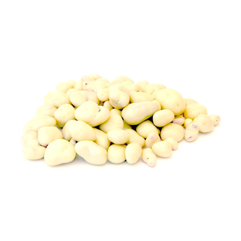 Arándanos cubiertos con chocolate blanco, de tamaño pequeño a medio, textura brillante.